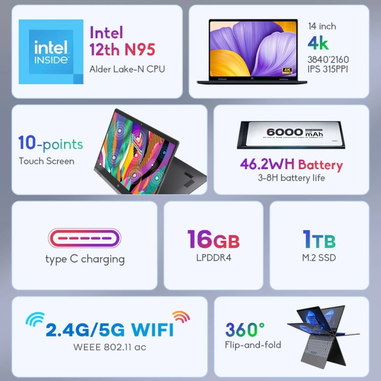 Ninkear N14 Yoga 14 inch Laptop 16GB 1TB Wins 11 Home In tel Al der Lake-N95 4K UHD 2 in 1 Touch Screen Laptop Products Description 1. CPU: In tel Al der Lake-N952. Base Frequency: 1.70GHz3. Turbo Frequency: 3.40GHz4. Cores/threads: 4 Cores 4 Threads5. Operating system: Wins 11 Home6. RAM: 16GB DDR4 3200MHz7. ROM: 1TB…